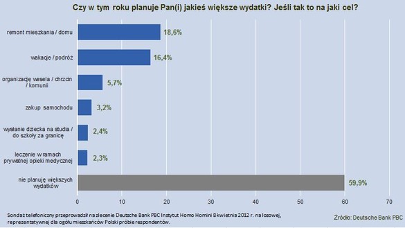 Z najnowszego badania Deutsche Bank PBC przeprowadzonego w kwietniu przez Instytut Homo Homini wynika, że większe wydatki rozważa mniej niż połowa Polaków (ok. 40 proc.). Niemal 19 proc. ankietowanych ma zamiar zrobić remont mieszkania lub domu, a ponad 16 proc. chce pojechać na wakacje. To dwa najbardziej popularne cele, na które Polacy wydadzą większe pieniądze. Inne, takie jak zakup samochodu (3,2 proc.), organizacja wesela, komunii albo chrzcin (5,7 proc.) czy wysłanie dziecka na studia (2,4 proc.) są mniej popularne.