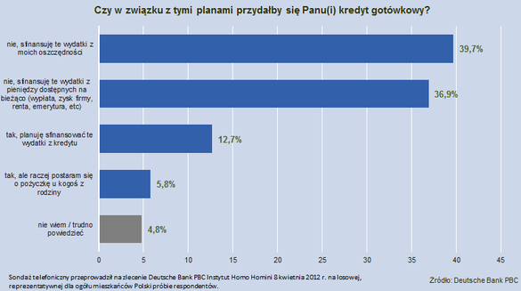 Wśród Polaków planujących jakiś większy wydatek niemal 13 proc. ma zamiar sfinansować go za pomocą kredytu, a tylko niespełna 6 proc. postara się o pożyczkę u kogoś z rodziny. Większość badanych woli jednak posiłkować się własnymi oszczędnościami (prawie 40 proc.) lub pieniędzmi otrzymywanymi na bieżąco – w ramach wypłaty, emerytury, renty etc. (37 proc.).