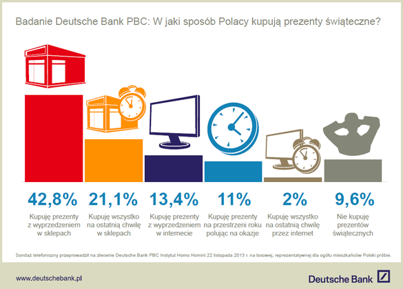 Deutsche Bank PBC sprawdził nie tylko, w jaki sposób płacimy za prezenty, ale także jak robimy nasze świąteczne zakupy. Niemal 43 proc. Polaków kupuje prezenty z większym wyprzedzeniem w sklepach, a 13,4 proc. robi wcześniej zakupy online. 11 proc. ankietowanych poluje w ciągu roku na okazje, wyprzedaże i promocje, z których korzysta z myślą o świątecznych prezentach. Skąd więc takie tłumy w sklepach tuż przed świętami co roku? Z badania wynika, że nadal co piąty ankietowany kupi w tym roku prezenty dopiero w ostatniej chwili.