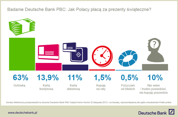 Drugą najczęściej wybieraną opcją jest karta kredytowa. Na taką odpowiedź wskazało niemal 14 proc. badanych. – To całkiem spory odsetek, zważywszy na fakt, że nie każdy z nas ma w portfelu tego typu kartę – komentuje Monika Szlosek z Deutsche Bank. – Być może ankietowani docenili podstawową zaletę karty kredytowej, czyli to, że dokonując płatności w grudniu, odkładają faktyczny moment poniesienia tego kosztu na kolejne miesiące. Dla wielu z nas takie odroczenie nie jest bez znaczenia, ponieważ grudzień to jeden z najtrudniejszych miesięcy dla domowego budżetu – mówi.