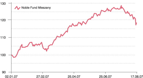 *Stopa zwrotu za okres 02.0.2007 – 17.08.2007 dla Subfunduszu Noble Fund Mieszany wyodrębnionego w ramach Noble Funds FIO (Fundusz). Przedstawione wyniki mają charakter historyczny i nie stanowią gwarancji osiągnięcia podobnych w przyszłości. Źródło: obliczenia własne Noble Funds TFI S.A. na podstawie ogłaszanych wartości aktywów netto na jednostkę uczestnictwa. Fundusz nie gwarantuje realizacji celu inwestycyjnego, a indywidualna stopa zwrotu uzależniona jest od wartości jednostki uczestnictwa w momencie jej zbycia i odkupienia przez Fundusz oraz od wysokości opłaty manipulacyjnej i podatku od dochodów kapitałowych. Uczestnik musi liczyć się z możliwością utraty przynajmniej części wpłaconych środków. Szczegółowe informacje dotyczące polityki inwestycyjnej, ryzyk związanych z inwestowaniem, a także tabela opłat manipulacyjnych obowiązujące w Noble Funds FIO znajdują się w prospekcie informacyjnym oraz jego skrócie dostępnych na stronie www.noblefunds.pl oraz u dystrybutorów.