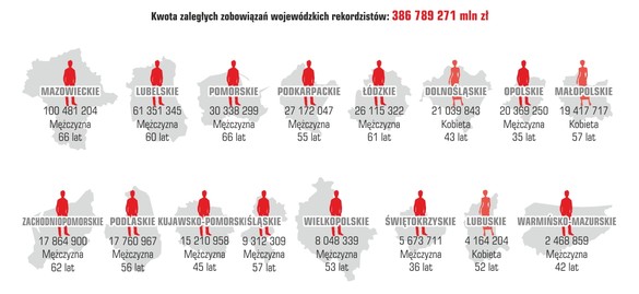 Łączna kwota zaległości przedstawionych w poniższym zestawieniu największych wojewódzkich rekordzistów – dłużników – zmniejszyła się z ponad 404 mln zł do około 386 mln zł.