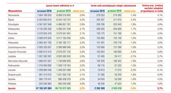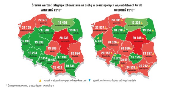 We wszystkich 16 województwach odnotowano wzrost wartości średniego zaległego zadłużenia przypadającego na osobę, podczas gdy jeszcze w poprzednim kwartale przeciętna malała