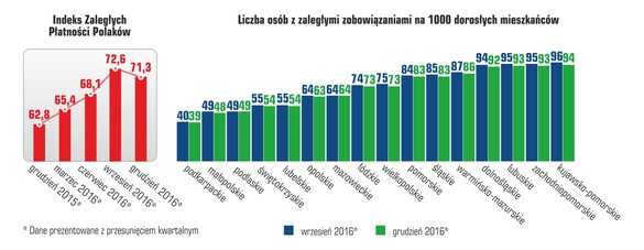Dane z bazy Rejestru Dłużników Biura Informacji Gospodarczej InfoMonitor oraz Biura Informacji Kredytowej, na temat osób fizycznych niepłacących w terminie swoich zobowiązań, po raz pierwszy od pięciu kwartałów przyniosły spadek Indeksu Zaległych Płatności Polaków. Indeks pokazujący liczbę osób fizycznych, nieradzących sobie z terminowym regulowaniem zobowiązań pozakredytowych oraz kredytowych, przypadającą na 1000 dorosłych Polaków obniżył się o 1,3 pkt do 71,3 pkt. Podobnie stało się w 14 województwach, wyjątkiem okazały się jedynie Podlasie i Mazowsze, gdzie liczba niesolidnych dłużników przypadająca na 1000 dorosłych mieszkańców, utrzymała się na tym samym poziomie.