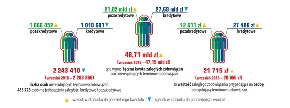 Łączna kwota zaległych zobowiązań kredytowych i pozakredytowych na koniec września 2016 r., wyniosła 48,71 mld zł. W stosunku do danych z czerwca, nieterminowe płatności Polaków odnotowane w Rejestrze Dłużników BIG InfoMonitor oraz w bazie Biura Informacji Kredytowej wzrosły o 1,52 mld zł. Stało się to głównie za sprawą zobowiązań pozakredytowych, których przybyło o 1,81 mld zł, podczas gdy przeterminowanych zobowiązań kredytowych ubyło o prawie 0,3 mld zł. Mimo spadku, na skalę zaległości Polaków wciąż dominujący wpływ mają niespłacane kredyty. Ich udział w całej kwocie stanowi 57 proc.