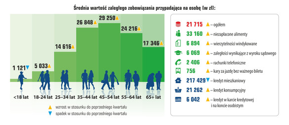 Średnia wartość zaległości przypadająca na osobę w porównaniu z danymi opublikowanymi we wrześniu, zwiększyła się o ponad tysiąc złotych do 21 715 zł. Jej wzrost odnotowano