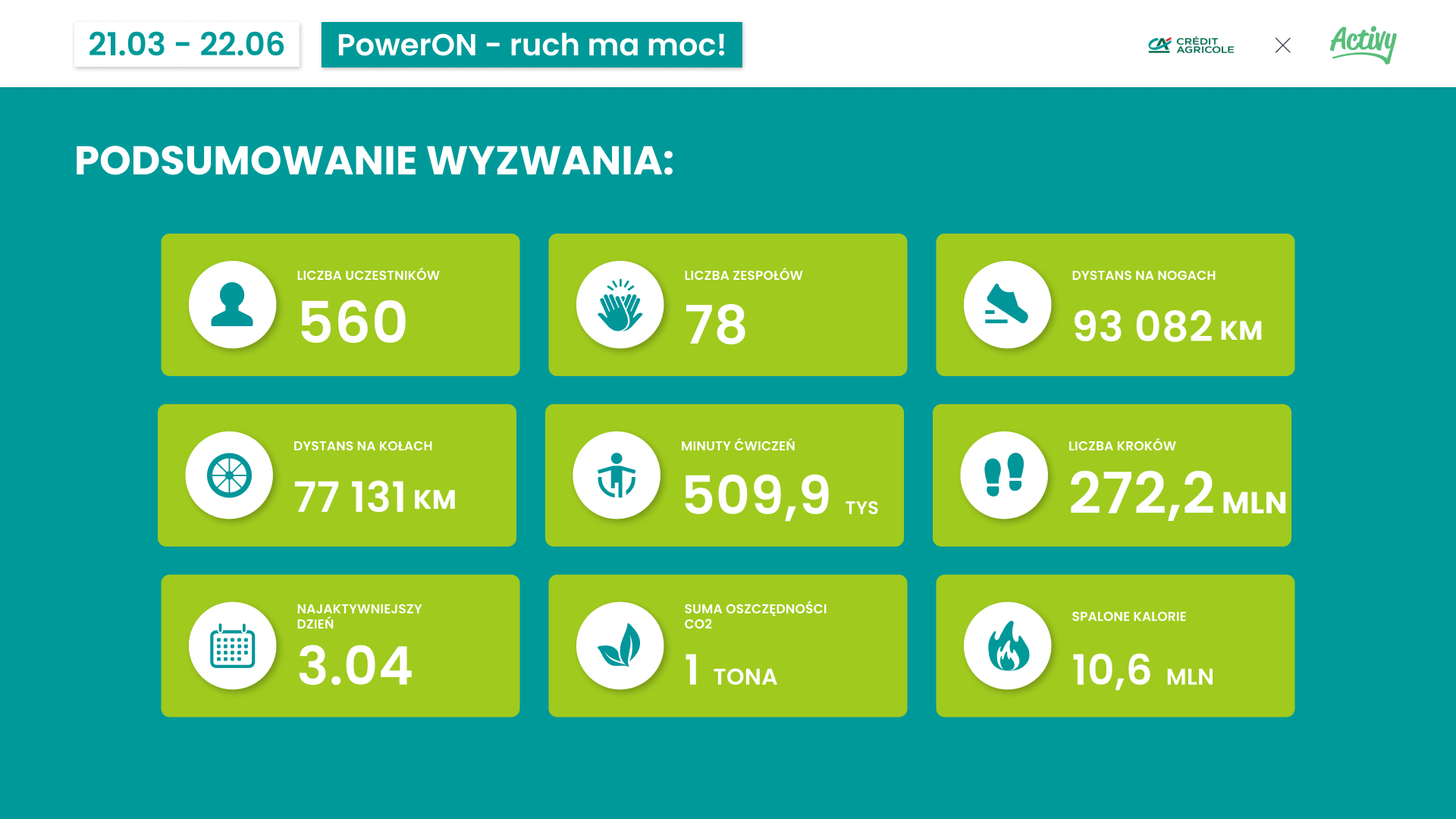 Ruch ma moc – przekonali się o tym pracownicy Credit Agricole, którzy wzięli udział w wyzwaniu sportowym. Dzięki ich aktywności fizycznej bank przekazał darowiznę finansową na rzecz Fundacji Sportolubni, która wspiera i aktywizuje dzieci i młodzieży z niepełnosprawnością intelektualną oraz ich rodziny.