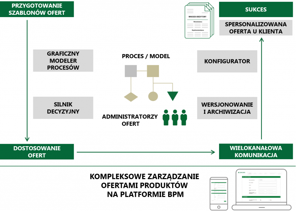 Sukces na rynku usług finansowych zależy m.in. od skutecznego  dotarcia do klienta ze spersonalizowaną ofertą. Musi ona być oparta na informacjach zgromadzonych w zasobach i systemach instytucji. Kluczowe dla tego procesu jest kompleksowe zarządzanie ofertami produktów i usług, począwszy od procesu ich przygotowania, poprzez ich modyfikowanie, skończywszy na dotarciu do odbiorcy właściwym kanałem komunikacji. Efektywne działanie w tym obszarze, przy dużej bazie klientów bez wsparcia dedykowanego rozwiązania informatycznego jest praktycznie niemożliwe.