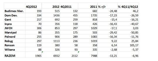 Z omawianej grupy podmiotów zdecydowanie na plus wyróżniają się dwa: Robyg oraz Ronson, które zarówno w ujęciu ostatniego kwartału jak i całego ubiegłego roku odnotowały progres w stosunku do roku 2011. Uwagę zwraca zwłaszcza wynik tej ostatniej spółki, która sprzedaż w 4 kw. 2012 wręcz podwoiła w odniesieniu do analogicznego okresu poprzedniego roku. Czy w związku z tym można podejrzewać, że wynik Ronsona jest skutkiem maksymalnego cięcia cen, a tym samym marży deweloperskiej decydującej o rentowności sprzedaży? Raczej jest wynikiem kombinacji niskiej bazy, tzn. słabej sprzedaży w IV kw. 2011 roku i dokładnie odwrotnej sytuacji w ostatnim kwartale 2012. Zresztą rynek giełdowy dostrzega i docenia efekty pracy zarządu spółki, której notowania giełdowe od początku września ub. roku zanotowały 50-proc. wzrost, a więc znacznie powyżej średniej dla branży mierzonej wzrostem indeksu WIG-deweloperzy.