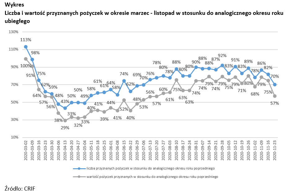 Według danych CRIF w skali miesiąca liczba udzielonych pożyczek w listopadzie spadła o 17,7 proc. r/r, z kolei wartość udzielonego finansowania była niższa o 27,2 proc. rok do roku. Dane wskazują na słabnięcie kondycji rynku w pierwszym i ostatnim tygodniu listopada. W wartościach bezwzględnych, przeciwnie do bazy BIK, dane sprzedażowe poprawiały się do końca miesiąca. Pogłębienie spadków rok do roku, widoczne szczególnie w ostatnim tygodniu listopada, które równocześnie jest istotnie silniejsze niż sugeruje baza BIK, wynika z wysokiej bazy porównawczej, co prawdopodobnie oznacza, że druga fala epidemii nie spowodowała załamania rynku w porównaniu z październikiem.