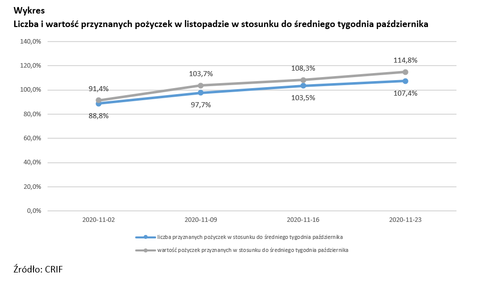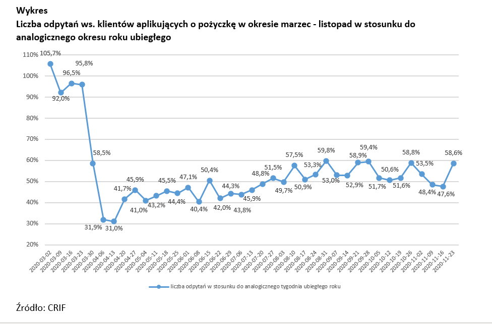 Według bazy CRIF liczba odpytań ws. klientów aplikujących o pożyczkę spadła w pierwszej połowie listopada w porównaniu do października, lecz wynika to w większym stopniu z wysokiej bazy porównawczej w poszczególnych tygodniach niż z pogarszania się danych w ujęciu bezwzględnym. Różnice w danych mogą również wynikać z zastosowanej metodologii, która w przypadku danych CRIF uwzględnia dokładnie tę samą bazę porównywanych firm w całym analizowanym okresie.