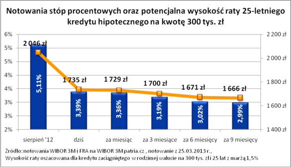 W najbliższych miesiącach efekt wygaszenia dopłat do kredytów będzie niknął, a coraz ważniejsze będzie się stawało to, że po obniżeniu stóp procentowych przez Radę Polityki Pieniężnej do rekordowo niskiego poziomu, relatywnie tanie są też kredyty hipoteczne. W efekcie pożyczanie pieniędzy na zakup własnego ” M” stało się znacznie bardziej przystępne. Pożyczając dziś 300 tys. zł na 25 lat (z marżą 1,5%) trzeba się liczyć z ratą na poziomie 1735 zł miesięcznie. Dla porównania w sierpniu 2012 roku (wtedy zapowiedzi RPP zapoczątkowały spadki stawek WIBOR) było to 2046 zł, czyli o ponad 300 zł miesięcznie więcej. Co więcej, kontrakty terminowe na stopy procentowe (FRA) sugerują, że najbardziej prawdopodobnym scenariuszem jest dalsza korekta w tym zakresie. Za 9 miesięcy WIBOR 3M może być notowany na poziomie niespełna 3%. Oznaczałoby to, że rata wcześniej wspomnianego kredytu mogłaby spaść do poziomu 1670 zł miesięcznie. Nawet jeśli dziś efektów tych zmian jeszcze nie widać, to spadek kosztu kredytu bez wątpienia wpłynie pozytywnie na skalę popytu na mieszkania. Szczególnie jest to prawdopodobne, biorąc pod uwagę, że już dziś wydatki związane z zakupem mieszkania na kredyt (nawet przy 100% LtV) oraz jego utrzymaniem mogą być niejednokrotnie niższe niż wydatki związane z wynajęciem identycznego lokum. Stan taki stymuluje popyt ze strony inwestorów jak i najemców, którzy posiadając zdolność kredytową realizują swoje potrzeby mieszkaniowe na rynku najmu.
