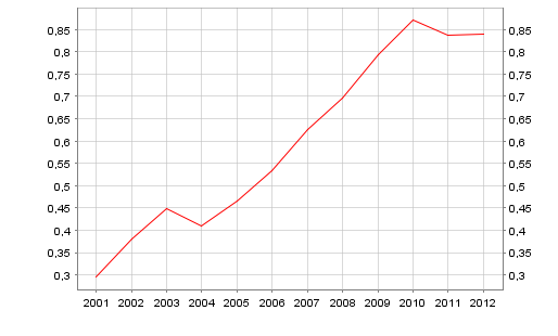 W perspektywie pięcioletniej (lata 2007-2011) największy wzrost pod tym względem zanotowała Finlandia (z 0,74 do 1,45) oraz Luxemburg (wzrost z 1,84 do 3,27) i Dania z 0,99 do 1,36). W przypadku naszego kraju wzrost wynosił z 0,7 do 0,84. Największe spadki dotyczyły natomiast Hiszpanii oraz Grecji.