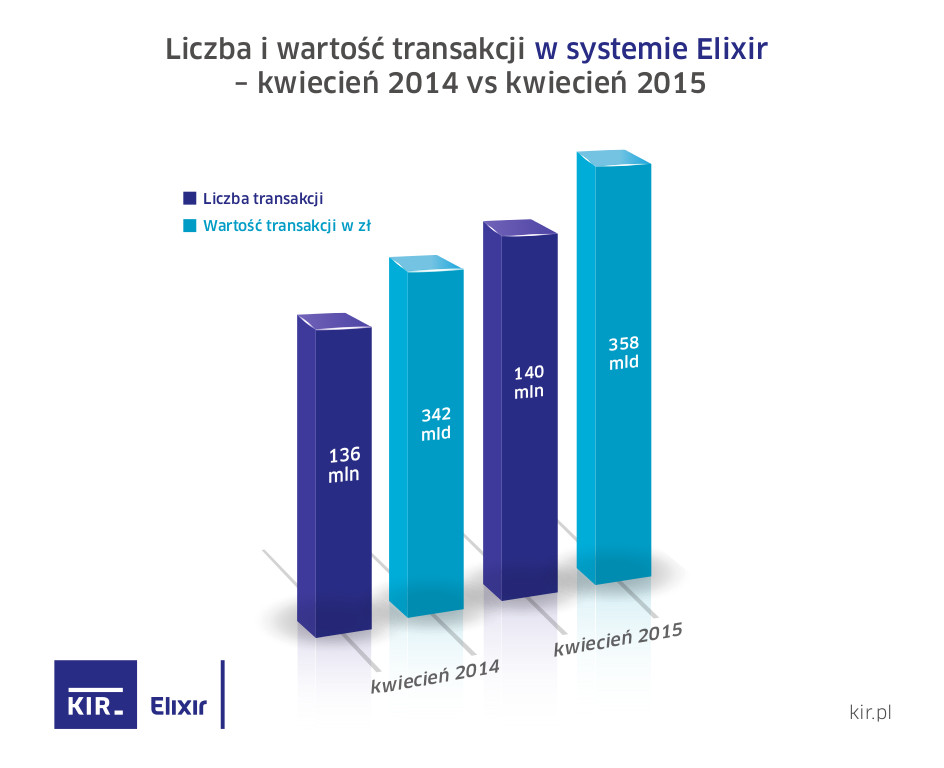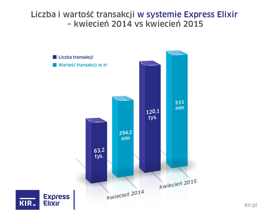 Kwiecień był kolejnym miesiącem rozwoju systemu Express Elixir. W tym okresie rozliczonych zostało ponad 120 tys. przelewów natychmiastowych o wartości 511 mln zł. W stosunku do danych raportowanych w kwietniu 2014 r., liczba transakcji zwiększyła się niemal dwukrotnie (z 63 tys. transakcji), przy równoczesnej zwyżce wolumenu obrotu o 74 proc. (z 294 mln zł). Najwyższą w skali miesiąca, średnią dzienną liczbę transakcji zanotowano w piątek, 10 kwietnia – system rozliczył wówczas 7,1 tys. komunikatów.