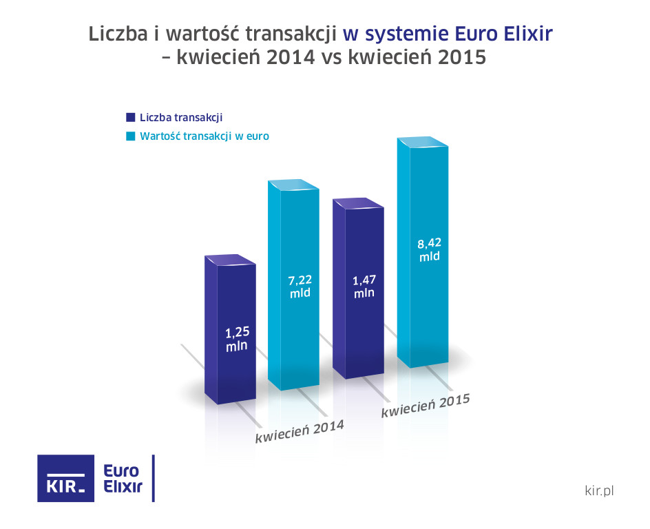 Liczba transakcji rozliczonych w systemie Euro Elixir wyniosła w kwietniu br. ponad 1,4 mln, przekraczając 8,4 mld euro. W porównaniu do kwietnia 2014 r., wzrosły zarówno liczba transakcji – o 217 tys., jak i wartość obrotów – o 1,2 mld euro.