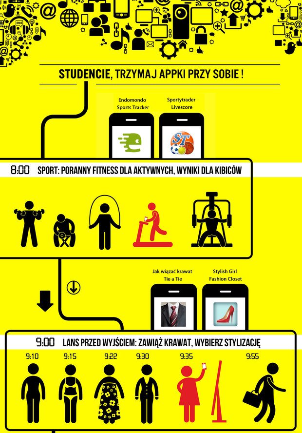 Po porannej dawce ruchu czas spojrzeć w lustro i przygotować się na wizytę w murach uczelni. Tym mniej wyedukowanym w zawiązaniu krawatu na specjalne okazje pomoże aplikacja Tie A Tie. A dziewczęta, dzięki smartfonowi, odeślą do lamusa odwieczny problem – co na siebie założyć? Stylish Girl umożliwia bowiem sfotografowanie rzeczy z własnej szafy i skomponowanie w zaledwie kilka sekund gotowego zestawu.