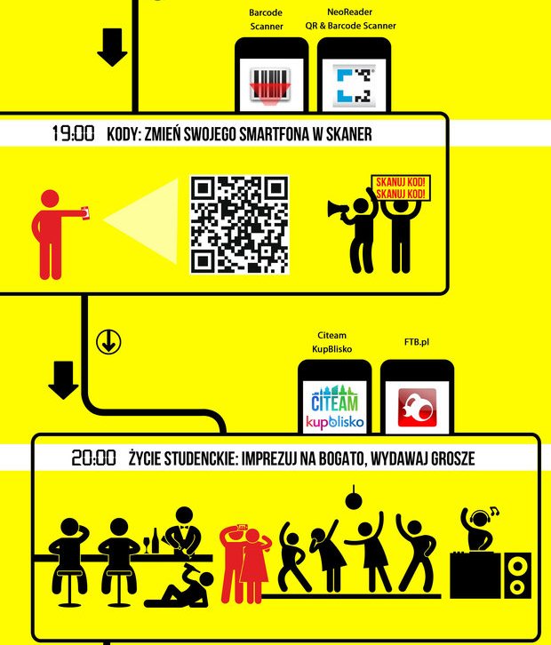 Nadchodzi wieczór, kiedy niejeden student zamiast zaglądania do notatek wybiera integrację w gronie innych żaków. Co jednak począć, gdy stan konta nie wprawia w imprezowy nastrój? Nie wszystko stracone – ci bardziej przedsiębiorczy mogą zdać się na smartfona i Kup Blisko, które w kilka sekund prześledzi aktualne rabaty restauracji oraz klubów w zależności od miejsca pobytu- obecnie w miejskich przestrzeniach całej Polski „krąży” aż 1400 aktywnych ofert. Po zakupie tańszych biletów wstępu do klubu, warto pochwalić się znajomym studenckim życiem na światowym poziomie. W tym celu korzystając z aplikacji Facebooka warto zameldować się wraz z całą grupą bawiących się. Trzeba jednak zwracać szczególną uwagę na to, gdzie się imprezuje i być zawsze krok przed innymi – w tym pomoże aplikacja FTB.pl, czyli podręczny informator o najgorętszych wydarzeniach z każdego miasta.