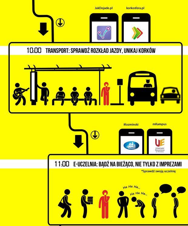 Smartfony coraz śmielej poczynają sobie w rękach Polaków – mobilne aplikacje pozwalają wyszukać promocje, przeskanować ceny w „realu” i porównać z tymi w sieci, przeliczyć kalorie, a nawet zawiązać krawat. Najbardziej mobilną grupą w Polsce, wg badań, są studenci. Jak wygląda zatem dzień z życia żaka, który nie rozstaje się ze smartfonem wyposażonym w najnowsze aplikacje?