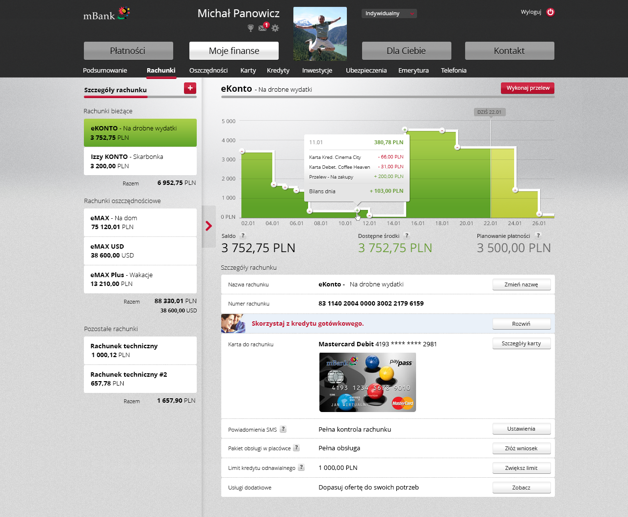 – Design to połączenie użyteczności i piękna. Pokazaliśmy, jak bardzo można wzbogacić tak wydawałoby się powszechny i „nudny” obszar bankowania, jak zarządzanie rachunkami – tłumaczy Michał Panowicz. – Tylko w tej dziedzinie zastosowaliśmy 14 innowacji, które na jednym ekranie pozwalają zrozumieć nie tylko historię salda, ale również poznać jego prognozę, szybko otrzymać kredyt lub ofertę korzystnej lokaty, ustawić podstawowe opcje konta, a wszystko to wykonując 80-90 proc. kliknięć mniej! – dodaje Panowicz. – Do tego nasz serwis jest po prostu przyjemny w użyciu dzięki cieszącej oko szacie graficznej i subtelnym animacjom oraz elementom interaktywnym.  Właściwe informacje pojawiają się na ekranie użytkownika wtedy, gdy są mu potrzebne – podsumowuje Panowicz.