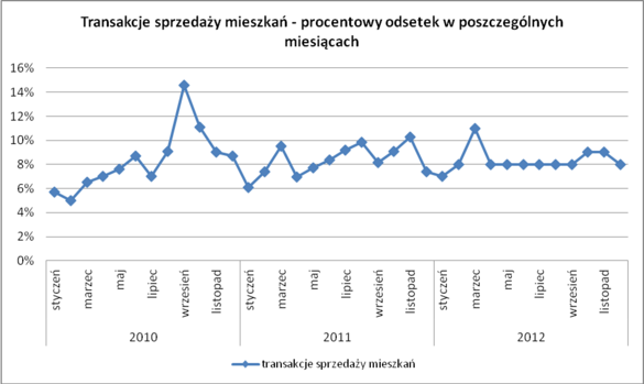 Procentowy udział transakcji w poszczególnych miesiącach roku. Źródło: Metrohouse & Partnerzy SA