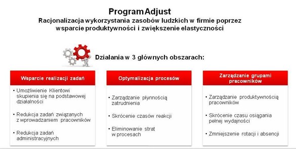 Kryzys gospodarczy uświadomił wielu firmom konieczność stosowania rozwiązań mających na celu optymalizację i uelastycznienie ich działań, racjonalizację kosztów i poszukiwanie oszczędności. Odpowiedzią na te potrzeby jest program redukcji kosztów „Adjust” stworzony przez Adecco Poland.