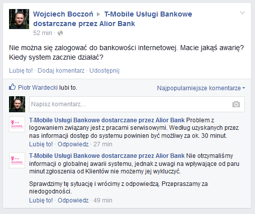 Bank nie potwierdził informacji o awarii: „Nie otrzymaliśmy informacji o globalnej awarii systemu, jednak z uwagi na wpływające od paru minut zgłoszenia od Klientów nie możemy jej wykluczyć. Sprawdzimy tę sytuację i wrócimy z odpowiedzą. Przepraszamy za niedogodności.” – napisano w komunikacie.