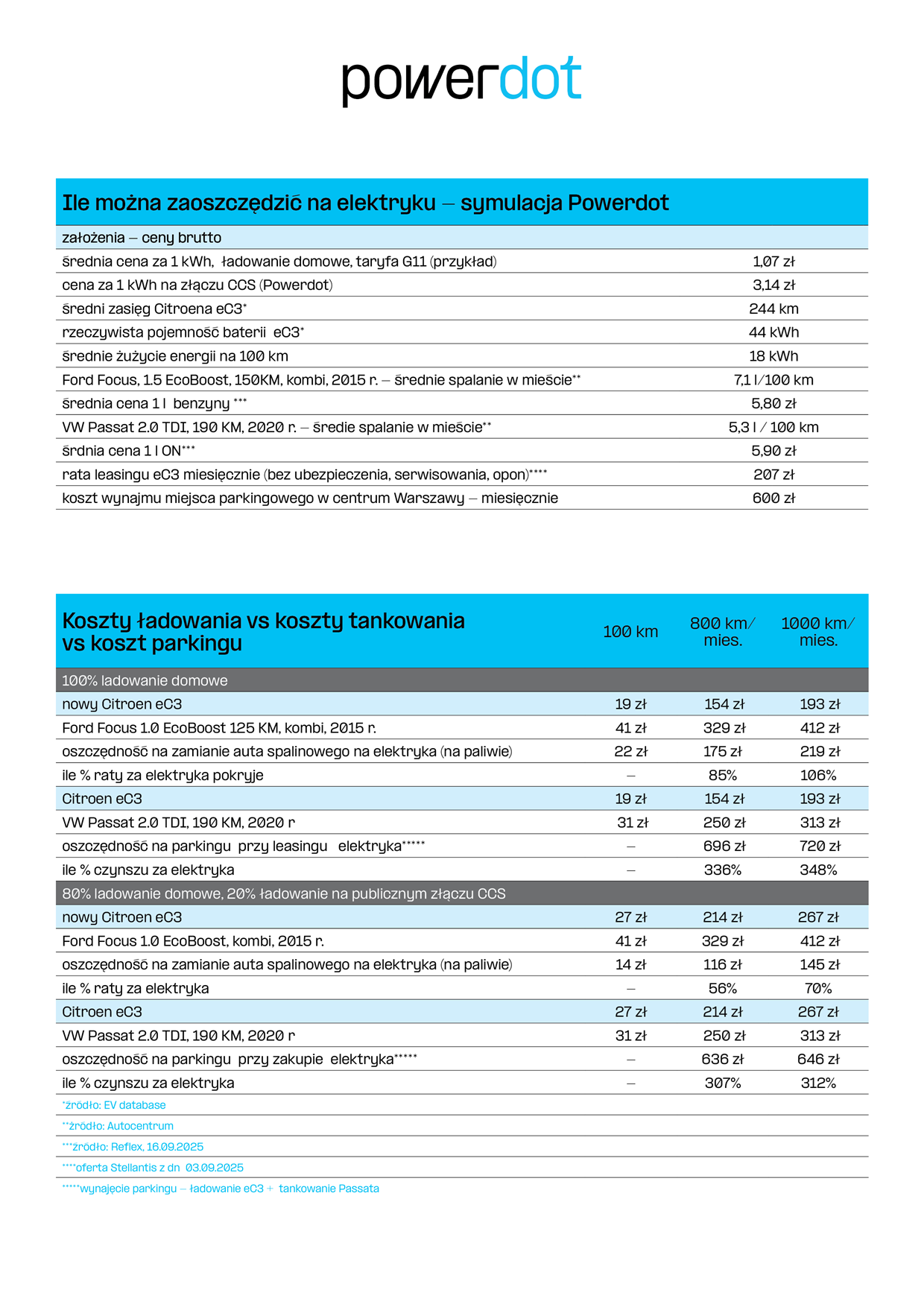 Eksperci Powerdot sprawdzili też, jak koszty ładowania kształtowałyby się na tle kosztów tankowania, gdyby energia zużywana przez elektryka pochodziła w 80% z gniazdka domowego, a w 20% ze stacji publicznych o dużej mocy. – Nawet jeśli ktoś zakłada, że będzie ładował się głównie w domu, a z auta korzystał do jazdy po mieście, to w praktyce pojawi się potrzeba wyjazdu elektrykiem także w trasę oraz ładowania na stacjach publicznych. Warto taki wariant tez uwzględnić w symulacji kosztów – podpowiada Grigoriy Grigoriev. Przyjęto, że koszt zakupu 1 kWh na złączu CCS wynosi 3,14 zł. Okazuje się, że koszt pokonania 100 km byłby w takim scenariuszu o 14 zł tańszy w przypadku podróżowania Citoenem eC3 niż Fordem Focusem kombi. Oszczędność dla dystansu 1000 km wyniosłaby natomiast 145 zł, co pozwoliłoby sfinansować niemal 70% raty za elektryka.