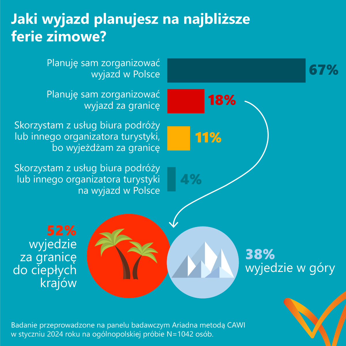 Spośród badanych, którzy ferie spędzą poza domem, 67% planuje samodzielnie zorganizować wyjazd w Polsce, a 18% na własną rękę wyjedzie za granicę – to o 6 pp. mniej niż w zeszłym roku. W kwestii zagranicznego kierunku dominują egzotyczne destynacje – więcej niż co drugi Polak wyjeżdzający na ferie za granicę wybierze ciepłe kraje. 38% respondentów wybierze się w góry, np. na narty czy snowboard.
