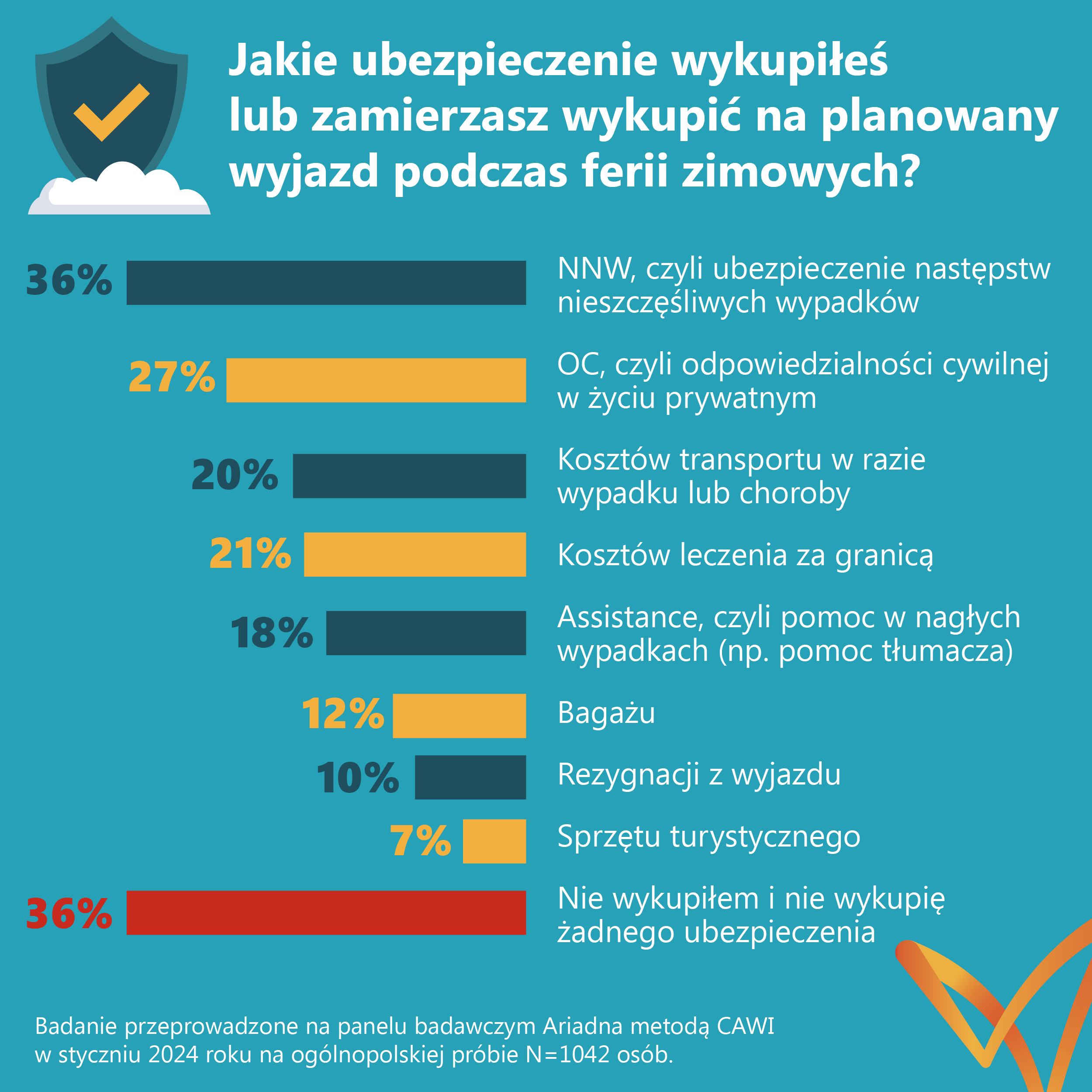 Podczas zeszłorocznych ferii wykupienie ubezpieczenia zadeklarowało 61% badanych. W tym roku przed wyjazdem już 64% osób zdecyduje się na ten krok. Najwięcej, bo 36% osób, zdecydowało się na ubezpieczenie NNW, czyli następstw nieszczęśliwych wypadków (dla porównania 31% w 2023). 27% badanych wykupiło polisę OC (odpowiedzialności cywilnej w życiu prywatnym), co jest wzrostem o 6 pp. rok do roku. 20% Polaków zadba o ubezpieczenie kosztów transportu w razie wypadku lub choroby, a co piąty wykupi ubezpieczenie kosztów leczenia za granicą.