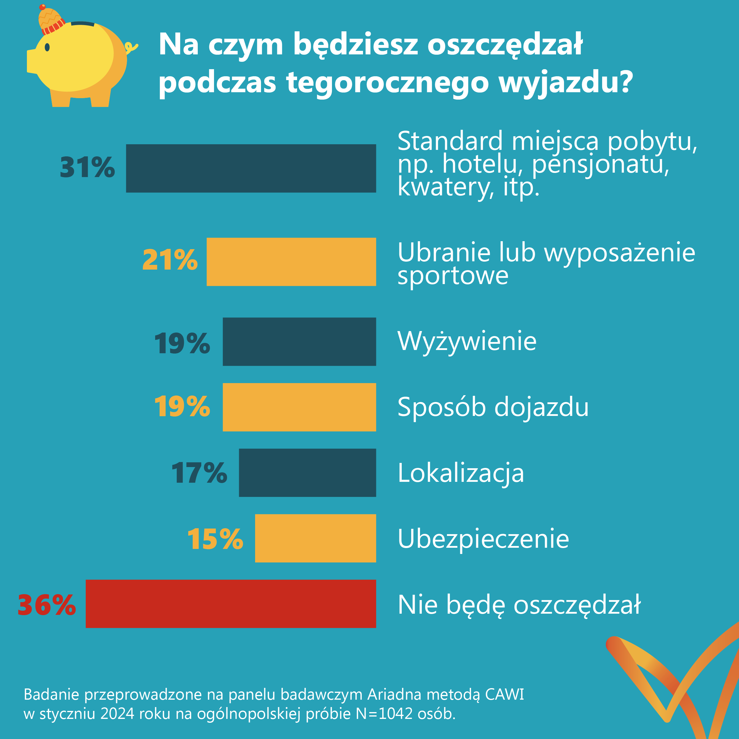 Podobnie jak w zeszłym roku podczas planowania tegorocznych wyjazdów na ferie Polacy będą szukali oszczędności. 31% będzie oszczędza na standardzie miejsca pobytu, np. hotelu czy kwatery (33% w 2023 r.). 21% chce zaoszczędzić na ubraniu lub wyposażeniu sportowym (25% w 2023), a 19% badanych wybierze bardziej ekonomiczną opcję dojazdu na miejsce. Tyle samo osób zostawi również mniej pieniędzy w restauracjach. Mocno spadła natomiast chęć oszczędzania na lokalizacji – w tym roku zadeklarowało ją 17% badanych, czyli o 9 pp. mniej niż w zeszłorocznej edycji badania.