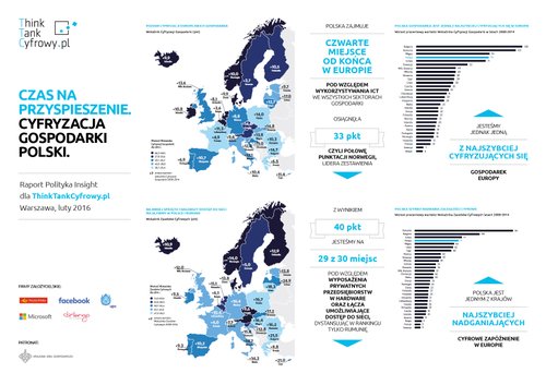 Polska pod względem rozwoju usług cyfrowych w sektorze prywatnym, kompetencji pracowników i jakości e-government sytuuje się dopiero na 28. pozycji na 30 badanych krajów Unii Europejskiej, jest za to jedną z najszybciej cyfryzujących się gospodarek (4. miejsce na 30 badanych krajów) – wynika z raportu „Czas na przyspieszenie. Cyfryzacja Gospodarki Polski”, przygotowanego przez Politykę Insight na zlecenie ThinkTankCyfrowy.pl – inicjatywy UPC Polska, Facebook, Microsoft, Dirlango i Poczty Polskiej.
