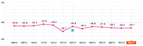 TNS Consumer Index to prowadzone od 1994 roku badanie, w którym w takiej samej postaci i kolejności zadaje się respondentom pytania dotyczące oceny bieżącej sytuacji swojego gospodarstwa domowego i kraju. W sierpniowej edycji badani nieco gorzej niż miesiąc wcześniej ocenili aktualną sytuację gospodarczą w kraju, a pozostałe elementy wskaźnika pozostały na niemal niezmienionym poziomie. TNS Consumer Index wyniósł -29,1 wobec -29,2 w lipcu.