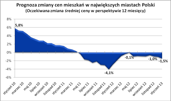 Bieżący rok rozpoczął się od niewielkiego pogorszenia prognoz cen mieszkań na najbliższe 12 miesięcy. Środkowa prognoza doradców Home Broker i Lions House sugeruje, że w tym horyzoncie czasowym przeciętne mieszkanie w dużym mieście straci na wartości 1,5%. Jest to wynik o 0,4 pkt. proc. gorszy niż w grudniu 2012 roku. Przypomnijmy jednak, że także w grudniu indeks cen transakcyjnych Open Finance i Home Broker pokazywał spadek przeciętnej ceny mieszkania w dużym mieście o 13,3% (r/r). Zamknięcie roku 2013 przeceną na poziomie 1,5% w skali roku oznaczałaby spore wyhamowanie.