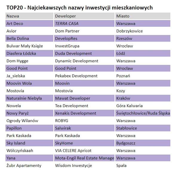 Podstawą do tworzenia nazw osiedli mieszkaniowych jest lokalizacja inwestycji oraz cechy otaczającego ją krajobrazu. Może być to nazwa ulicy lub dzielnicy, bądź widocznego na mapie zjawiska przyrodniczego np. lasu czy rzeki, nawet jeśli nie sąsiadują one bezpośrednio z budowanym osiedlem. Preferencje deweloperów potwierdzają dane serwisu domiporta.pl, z których wynika, że 54% projektów deweloperskich posiada określenia związane z lokalizacją. W co piątej nazwie pojawia się słowo obcojęzyczne, a w co dziesiątej element krajobrazu lub słowo nawiązujące do natury.