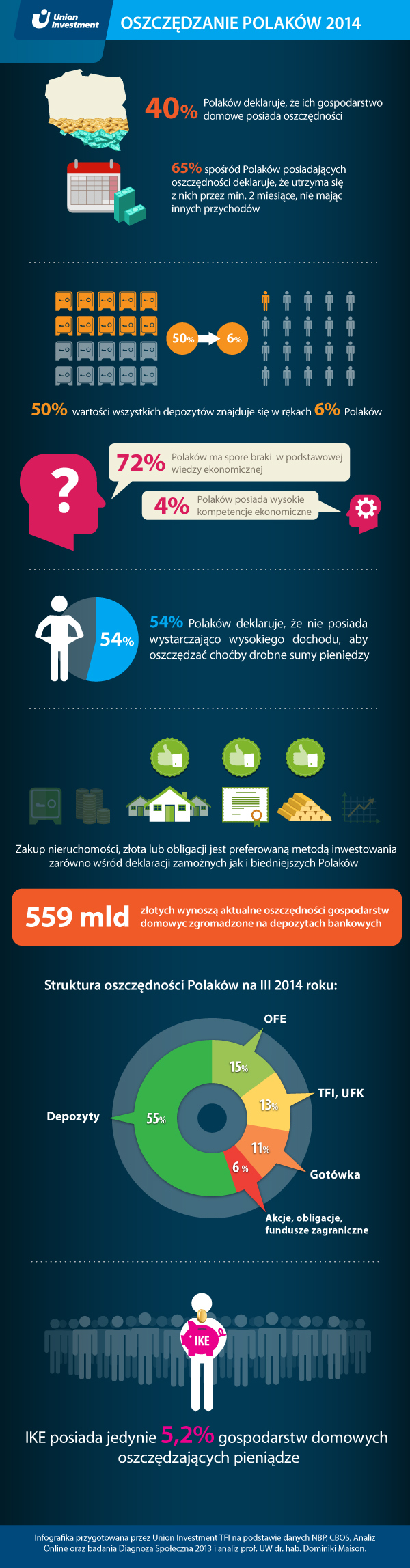 – Wśród naszych rodaków panują skrajne postawy wobec oszczędzania: albo odłożyliśmy równowartość kilku pensji, albo nie mamy nic – mówi Piotr Minkina z Union Investment TFI.– Aż połowa wszystkich depozytów w naszym kraju znajduje się w rękach zaledwie 6% Polaków. To oznacza, że ogromna większość naszych oszczędności należy do bardzo wąskiej grupy osób, a reszta posiada znikome zabezpieczenie finansowe lub nie ma go wcale –zauważa ekspert.