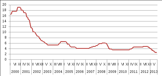 Główna stopa procentowa (stopa referencyjna) w Polsce w latach 2000-2013
