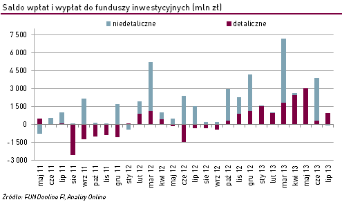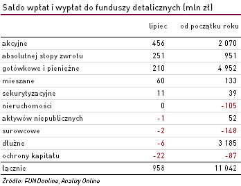 Lipiec był dziesiątym miesiącem z rzędu, gdy wartość wpłat do funduszy inwestycyjnych była wyższa od umorzeń. Ostatecznie napływ nowych środków wyniósł +0,8 mld zł. Choć to najniższy bilans sprzedaży w tym roku, to warto wspomnieć, iż napływ środków do funduszy detalicznych był wyższy niż w czerwcu. W minionym miesiącu fundusze te pozyskały prawie +1 mld zł. Saldo wpłat i wypłat do funduszy niedetalicznych było w lipcu ujemne i wyniosło nieco ponad -100 mln zł.