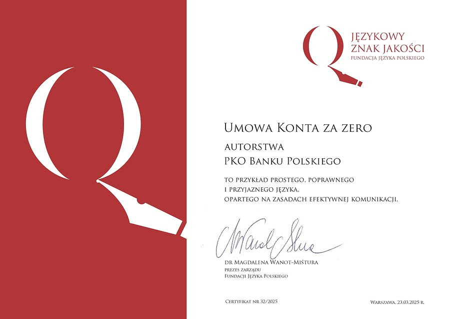 Językowy znak jakości przyznawany przez Fundację Języka Polskiego to wyróżnienie dla instytucji, które w komunikacji z klientami stosują ideę prostego języka i efektywnej komunikacji. Fundacja przyznała certyfikaty dla umów trzech kluczowych produktów PKO Banku Polskiego dla klientów indywidualnych. Wyróżnienie otrzymały umowy pożyczki gotówkowej, konta i karty kredytowej. Bank pracuje nad uproszczeniem kolejnych dokumentów.