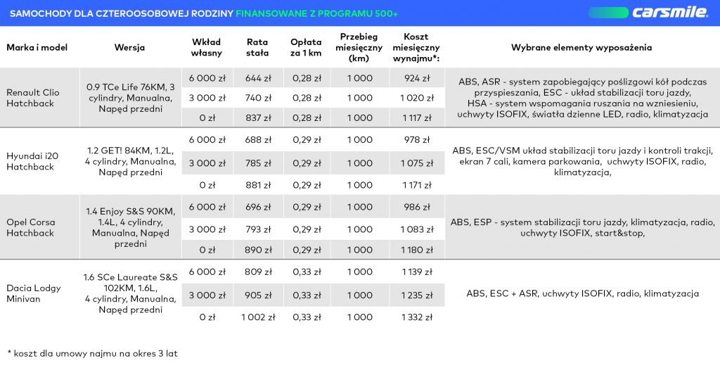 Renault Clio, Hyundai i20, Opel Corsa, Dacia Lodgy – to wybrane propozycje samochodów dla 4-osobowej rodziny, które można będzie sfinansować z rozszerzonego programu 500+ –  oceniają eksperci Carsmile. Miesięczne koszty użytkowania pojazdów mieszczą się w granicach lub nieznacznie przekraczają 1 000 zł, a samochody idealnie sprawdzą się w codziennym użytkowaniu, tj. podwożeniu dzieci do szkoły czy na zajęcia sportowe.