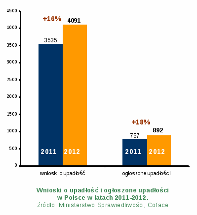 Grupa Coface, zajmująca się ubezpieczeniem należności, od 1997 roku monitoruje i analizuje upadłości polskich przedsiębiorstw. Jak wynika z danych pozyskanych z Ministerstwa Sprawiedliwości, w 2012 roku w polskich sądach złożono 4 091 wniosków o upadłość, z czego blisko 22 proc. postępowań zakończyło się ogłoszeniem upadłości. Liczba wniosków wzrosła w stosunku do roku 2011 o 16 proc., natomiast ogłoszonych upadłości było w 2012 r. więcej o 18 proc.