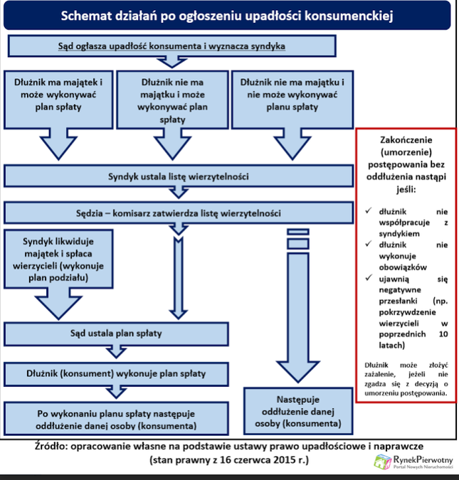 Przeszkodą w rozpoczęciu procedury upadłościowej nie będzie obecność tylko jednego wierzyciela, trwające postępowanie egzekucyjne lub brak majątku podlegającego egzekucji komorniczej (patrz poniższy schemat). Ustawodawca przewiduje natomiast inne ograniczenia. Na sądowe oddłużenie nie mogą liczyć konsumenci, którzy: