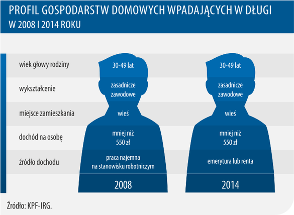 Jedno na dwanaście gospodarstw domowych w Polsce wpada w długi, co ujawnia raport: ZJAWISKO I PROFIL ZADŁUŻONYCH, przygotowany przez KPF na Dzień bez Długów 2014. Profil głowy gospodarstw domowych tej grupy to osoba w sile wieku 39-45 lat, względnie nieźle wykształcona, ale uzyskująca niskie dochody i zamieszkująca tereny wiejskie.