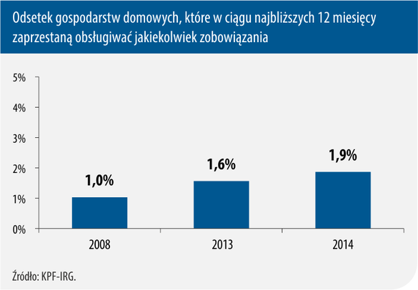 Jednocześnie może niepokoić wskaźnik uśrednionej rocznej dynamiki wzrostu liczby gospodarstw domowych, przewidujących duże kłopoty z regulowaniem zobowiązań lub nawet zaprzestanie ich spłat w najbliższych dwunastu miesiącach. W 2014 roku pesymistyczne przewidywania co do przyszłej jakości wywiązywania się zobowiązań stały się udziałem w sumie 11,1% ankietowanych, podczas gdy rok wcześniej podobne deklaracje ujawniło 10,7%. Różnica zaledwie 0,4 pp. może oznaczać, jednak, liczbę nawet 40 tysięcy gospodarstw domowych.