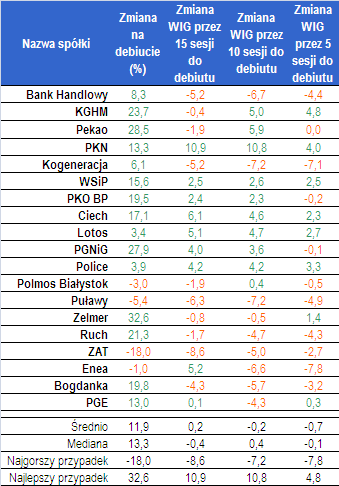 Zniżka notowań na warszawskiej giełdzie w czasie 15 sesji poprzedzających debiut walorów spółki ze „stajni” Skarbu Państwa, nie jest przypadkiem rzadkim. To z grubsza okres, jaki mija od rozpoczęcia zapisów na akcje do wprowadzenia ich do obrotu giełdowego. Średnio WIG rósł w takim okresie o 0,2%. Jednak w 10 z 19 przypadków, które wzięliśmy pod uwagę, koniunktura rynkowa nie sprzyjała debiutantom – wynika z analizy Home Broker Doradcy Finansowi.
