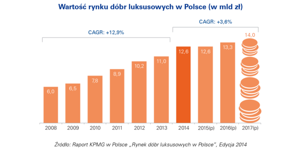 Wartość rynku dóbr luksusowych w Polsce wzrosła kolejny rok z rzędu i w 2014 roku sięgnęła ok. 12,6 mld zł. Po uaktualnieniu zeszłorocznych danych oznacza to wzrost o 15% w ujęciu rok do roku. Tak duży wzrost spowodowany był przede wszystkim zwiększeniem popytu na samochody luksusowe i premium (5,6 mld zł), ale duży udział w rynku miały także luksusowa odzież i dodatki (2,1 mld zł), usługi hotelarskie (1,3 mld zł), nieruchomości (1,1 mld zł) oraz meble (0,6 mld zł).