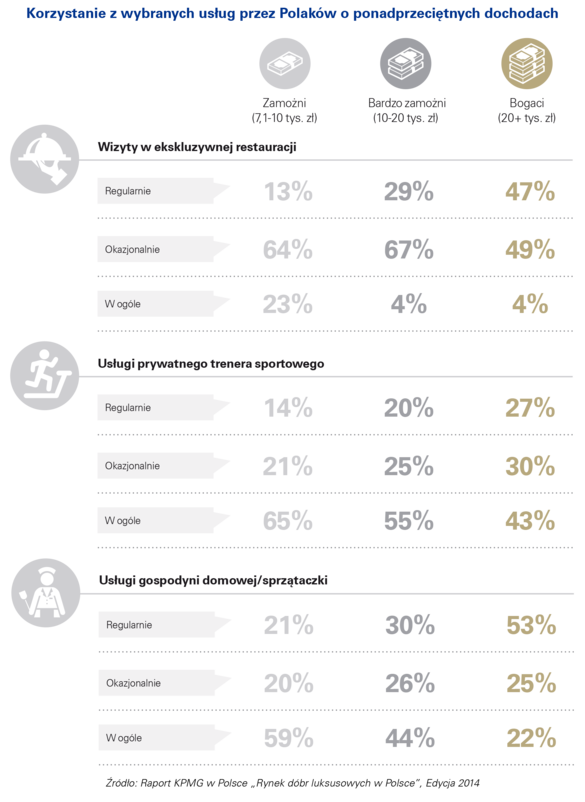 Badanie KPMG potwierdza, że wraz ze wzrostem poziomu dochodów rośnie także odsetek osób korzystających z określonych usług luksusowych. Duża część osób o ponadprzeciętnych dochodach deklaruje, że odwiedza ekskluzywne restauracje. Najczęściej regularnie odwiedzają je osoby bogate. Podobnie wygląda korzystanie z usług prywatnego trenera (regularnie korzysta z nich 14% zamożnych i 27% bogatych) czy gospodyni domowej (regularnie korzysta z tej usługi 21% zamożnych i 53% bogatych).