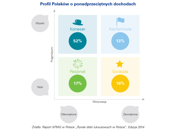 i usług. Badanie na próbie ponad sześciuset zamożnych i bogatych Polaków oraz uwzględnienie jednocześnie obu kryteriów umożliwiło podział na cztery typy nabywców – koneserów (motywacja wewnętrzna, wysoki pragmatyzm), pasjonatów (motywacja wewnętrzna, niski pragmatyzm), konformistów (motywacja zewnętrzna, wysoki pragmatyzm) oraz gwiazdy (motywacja zewnętrzna, niski pragmatyzm). Największą grupę (52% Polaków o ponadprzeciętnych dochodach) tworzą koneserzy, a najmniejszą – konformiści (13%). Znaczna większość zamożnych i bogatych Polaków (65%) podchodzi do luksusu w sposób pragmatyczny – wybiera produkty wysokiej jakości, ponieważ są trwałe i niezawodne. Dla prawie 70% Polaków o ponadprzeciętnych dochodach zakupy dóbr luksusowych wynikają z motywacji wewnętrznej. Oznacza to, że Polacy kupują dobra luksusowe, aby poczuć się lepiej i sprawić sobie przyjemność. Zdecydowanie rzadziej jest to motywacja zewnętrzna, czyli otaczanie się luksusem, ponieważ wymaga tego otoczenie.
