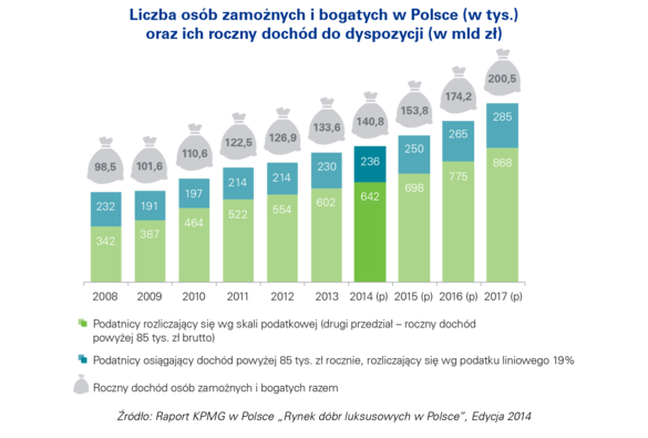 Jak wynika z V edycji raportu KPMG pt. „Rynek dóbr luksusowych w Polsce” liczba osób zamożnych i bogatych, czyli osiągających miesięcznie dochód powyżej 7,1 tys. zł brutto, stale wzrasta. W 2013 roku mieszkało ich w Polsce 832 tys., z łącznym dochodem netto o wartości 134 mld zł. Według prognoz KPMG do końca 2014 roku liczba zamożnych i bogatych Polaków wzrośnie do 878 tys. (wzrost o 6% w ujęciu rok do roku), natomiast ich łączny dochód do 141 mld zł (wzrost o 5% w ujęciu rok do roku). Jednocześnie, w 2014 roku w Polsce mieszkało 47 tys. osób posiadających aktywa płynne o wartości co najmniej 1 mln dolarów (HNWI, ang. high net worth individuals).