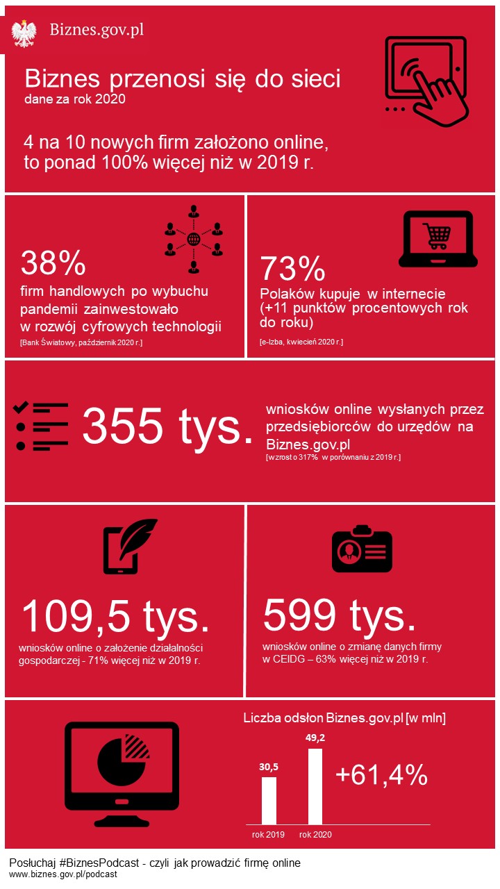 W czasie pandemii znacznie zwiększyło się zapotrzebowanie na usługi online dla przedsiębiorców. Liczba odsłon portalu dla firm Biznes.gov.pl od 2019 roku wzrosła o ponad 60 proc. W ostatnich miesiącach minionego roku przedsiębiorcy znacznie częściej niż do tej pory za pośrednictwem Internetu zmieniali także dane firm w CEIDG. W 2020 r. tą drogą wpłynęło do rejestru prawie 600 tys. wniosków.