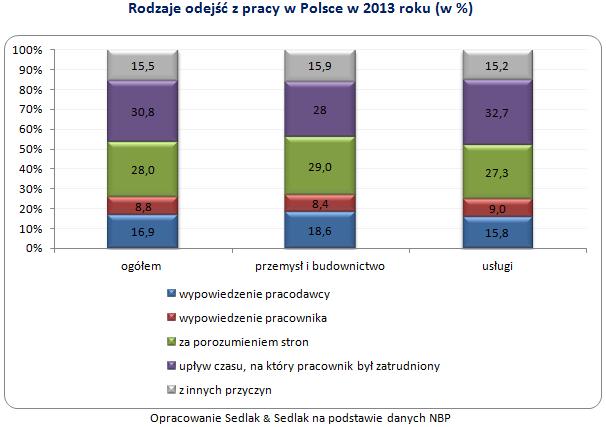 Z kolei dominującym sposobem odejść z pracy w 2013 roku było odejście na skutek upływu czasu, na który dana osoba była zatrudniona. Tę formę odejścia zadeklarowało blisko 31% respondentów. Kolejnym często wskazywanym sposobem odejść z pracy było rozwiązanie umowy za porozumieniem stron, co dotyczyło 28% badanych. Co ciekawe, wypowiedzenie umowy przez pracodawcę występowało ponad dwukrotnie częściej (16,9%) niż rozwiązanie umowy przez pracownika (8,8%).